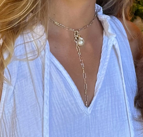 Connect a bracelet to the chain for a stylish hanging lariat.