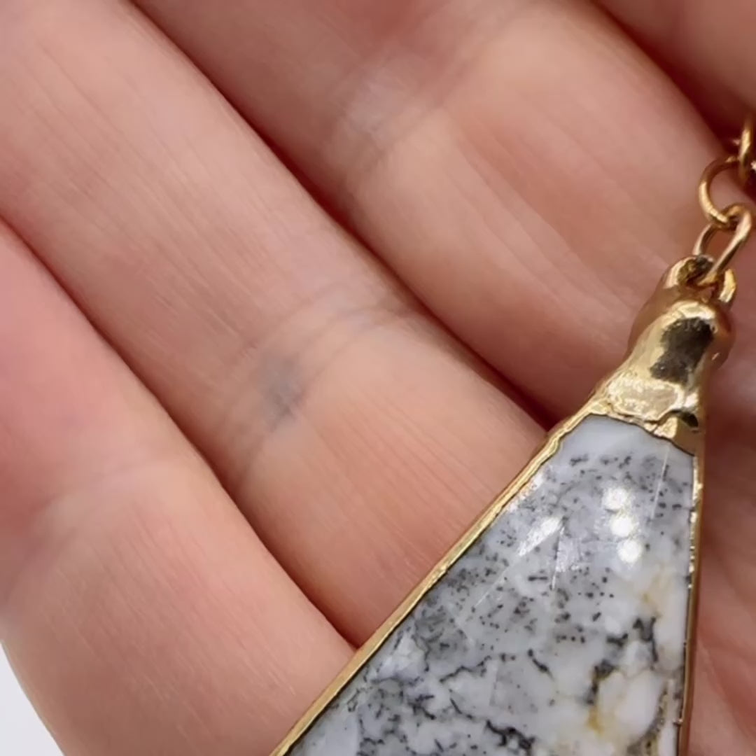 Introducing our Dendritic Opal Lariat Necklace. It features a dainty gold chain and a 24-karat electroformed triangle pendant—a modern heirloom for any jewelry lover.