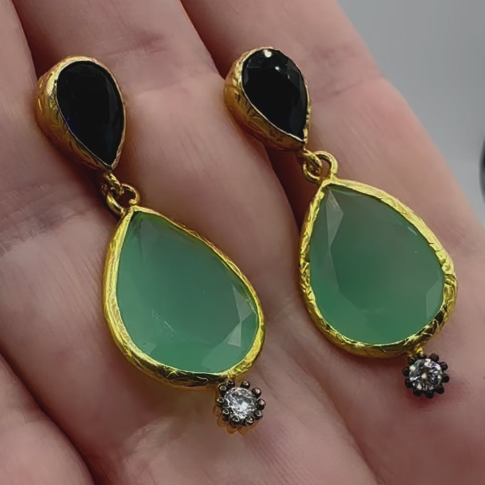 Add a touch of enchantment to any outfit with our Green Chalcedony and Black Onyx Earrings. Handcrafted with faceted amethyst gemstones and sparkling CZ's, these Turkish-crafted earrings exude sophistication. The silver and 18k gold plating over brass add a touch of luxury to any occasion. Elevate your style with these classy earrings.