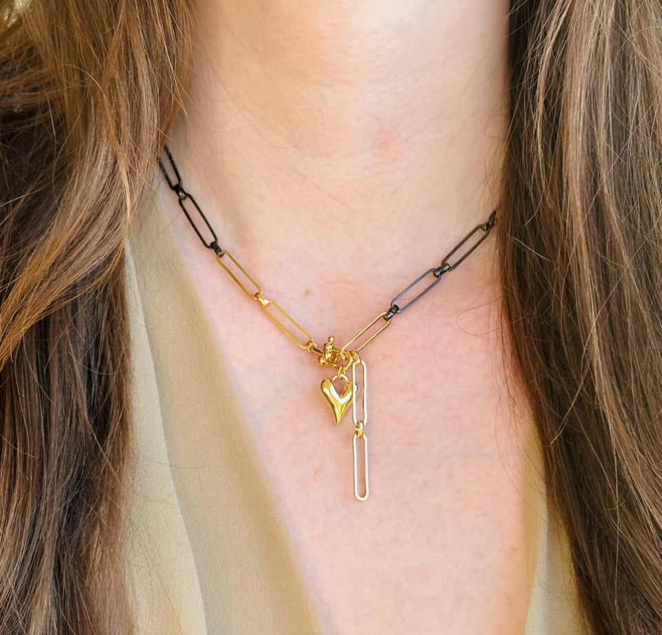 Mixed Metal Paper Clip Chain Necklace- Gold & Black