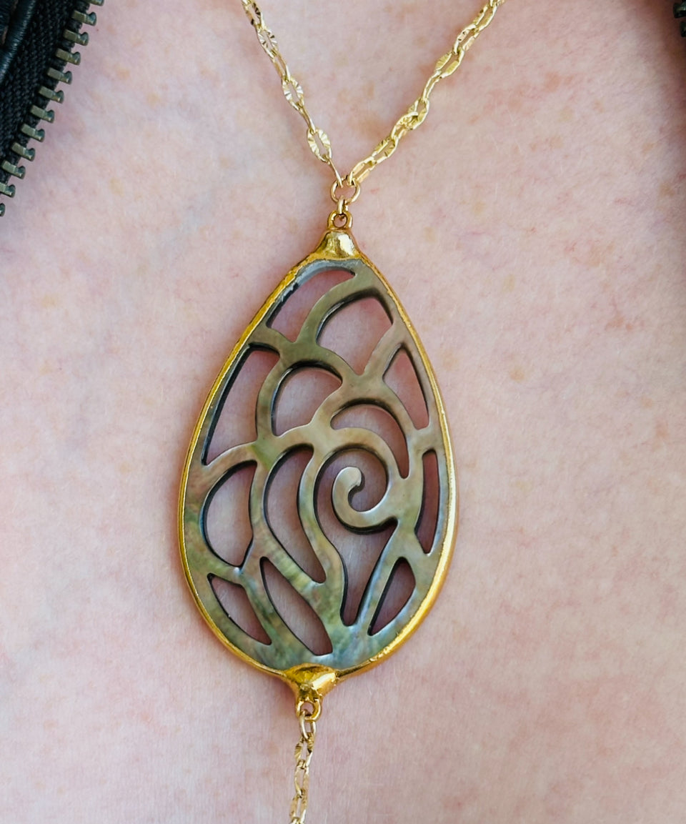 Make a statement and elevate your style with our one-of-a-kind Grey Mother-of-Pearl Necklace. This unique lariat showcases a round white textured design and a small coin charm. This statement piece is a must-have for any mother-of-pearl lover, perfect for a night out or a casual look. Accented with 24Kt electroplated gold, it has three times more gold than traditional fashion jewelry.