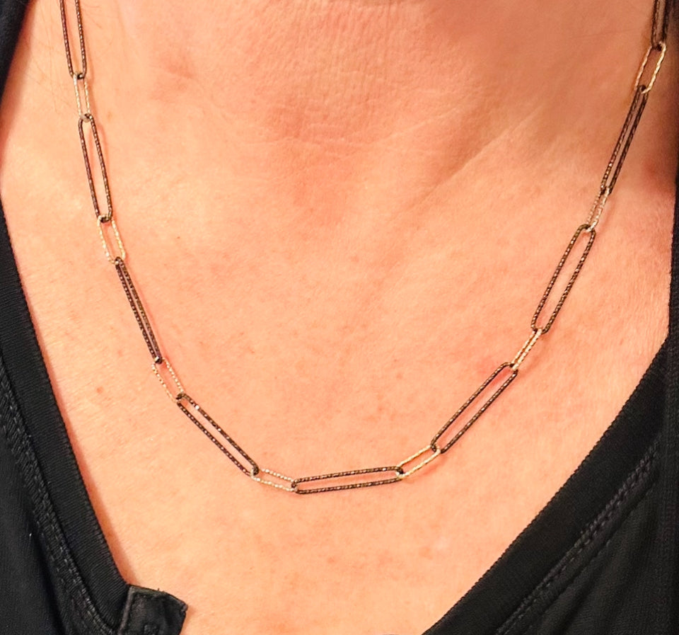Add a modern edge to your look with our Mixed Metal Paper Clip Necklace. Crafted from Italian high-quality materials, this piece features gold and black accents, along with unique diamond cut finish paper clip links, for a stylish, multi-wear look. The necklace is crafted from 24-karat electroformed gold and features a black finish over brass.