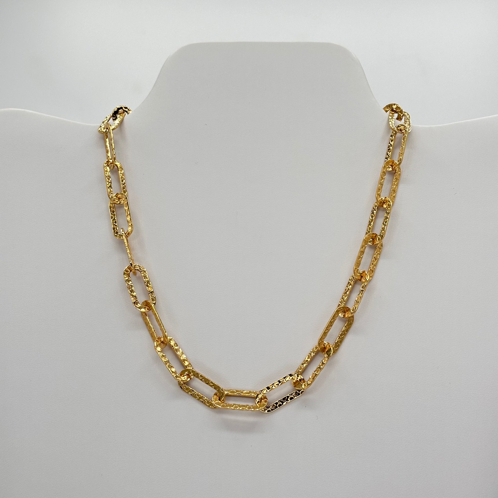 Introducing Rina: a stunning hammered paper clip necklace that adds a touch of elegance to any outfit. The lightweight chain glimmers in the light and can be worn on its own or layered with other pieces. Made with 24k electroformed gold, this necklace is crafted with 5 to 7 times more gold than most fashion jewelry.