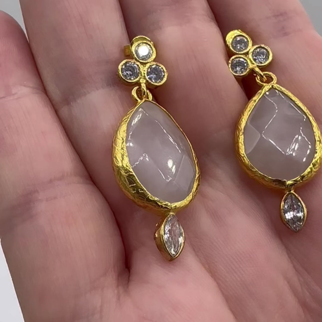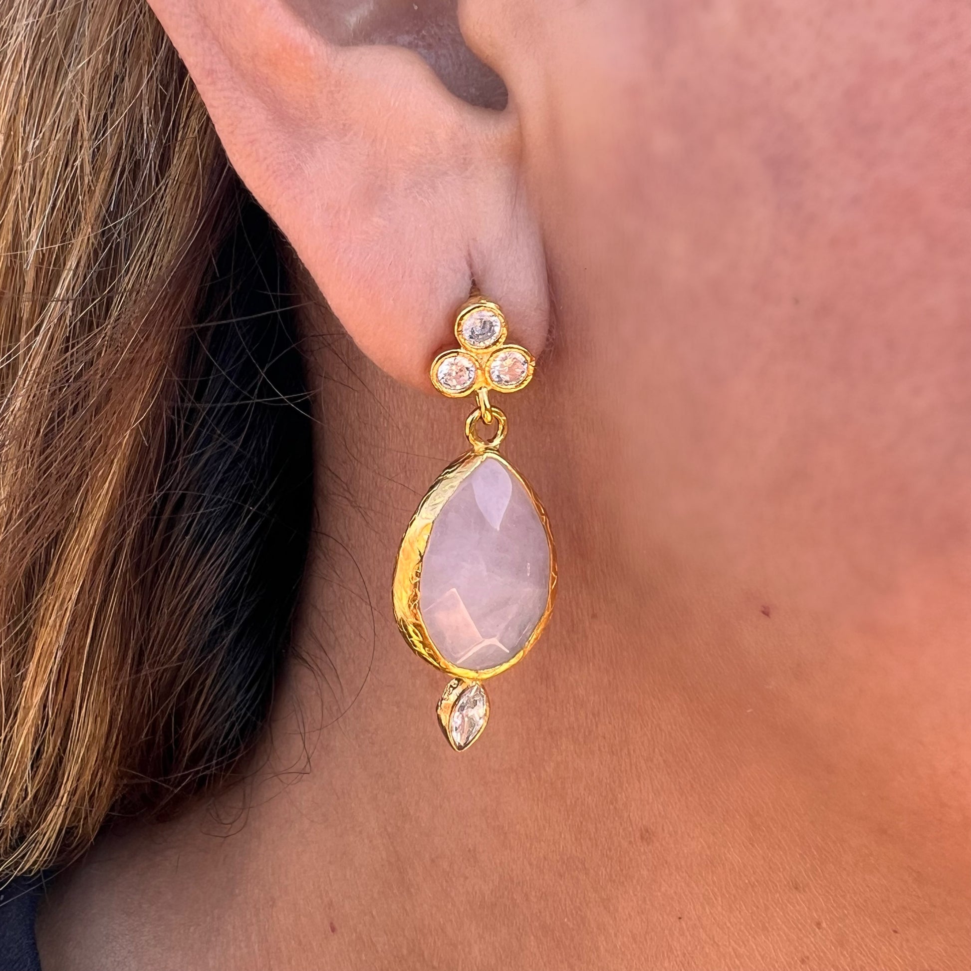 Get ready to fall head over heels for these stunning Gemstone Earrings! featuring stunning faceted Rose Quartz gemstones and sparkling CZ's, these Turkish-designed earrings are versatile enough to elevate any outfit, whether you're dressing up or down. Made with silver and 18 k gold plated over brass.